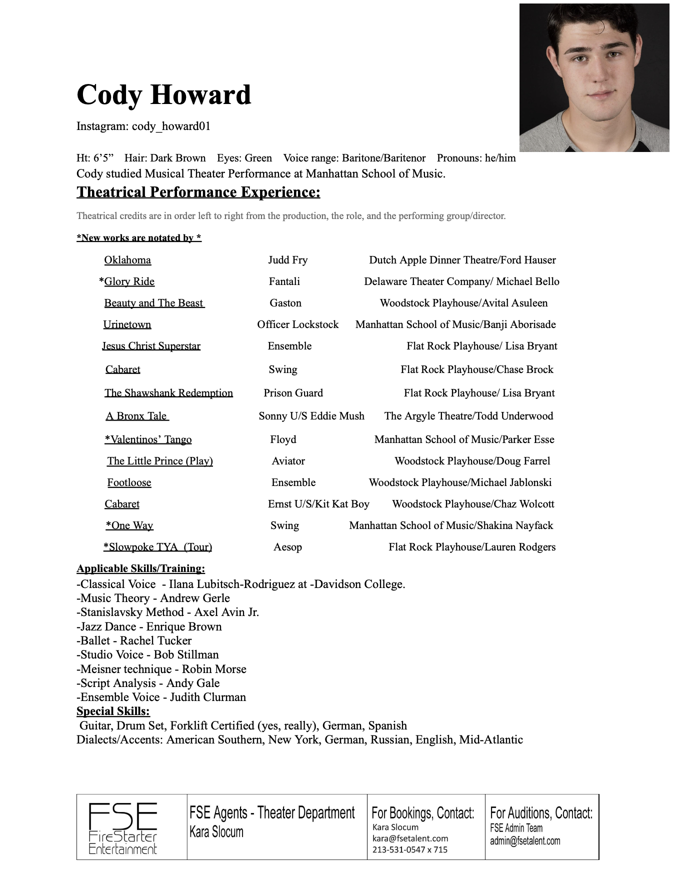 Howdy! My name is Cody. I’m a Baritone Singer/Actor from North Carolina, currently based out of NYC! I studied Musical Theater at Manhattan School of Music, where I was trained in Stanislavsky & Meisner method, Music Theory, Classical & Contemporary voice, Ballet, and Jazz Dance.